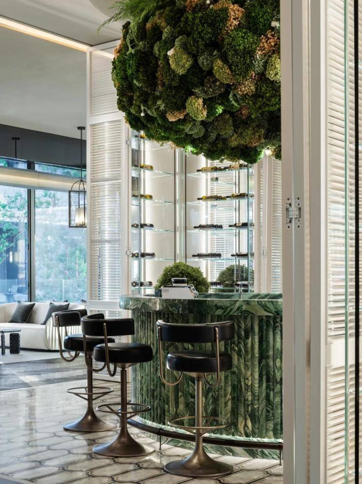 在花园大堂吧,永生花装饰吊顶、绿奢石台面,水晶玻璃酒柜,打造出复古又摩登的绮丽奢华感。