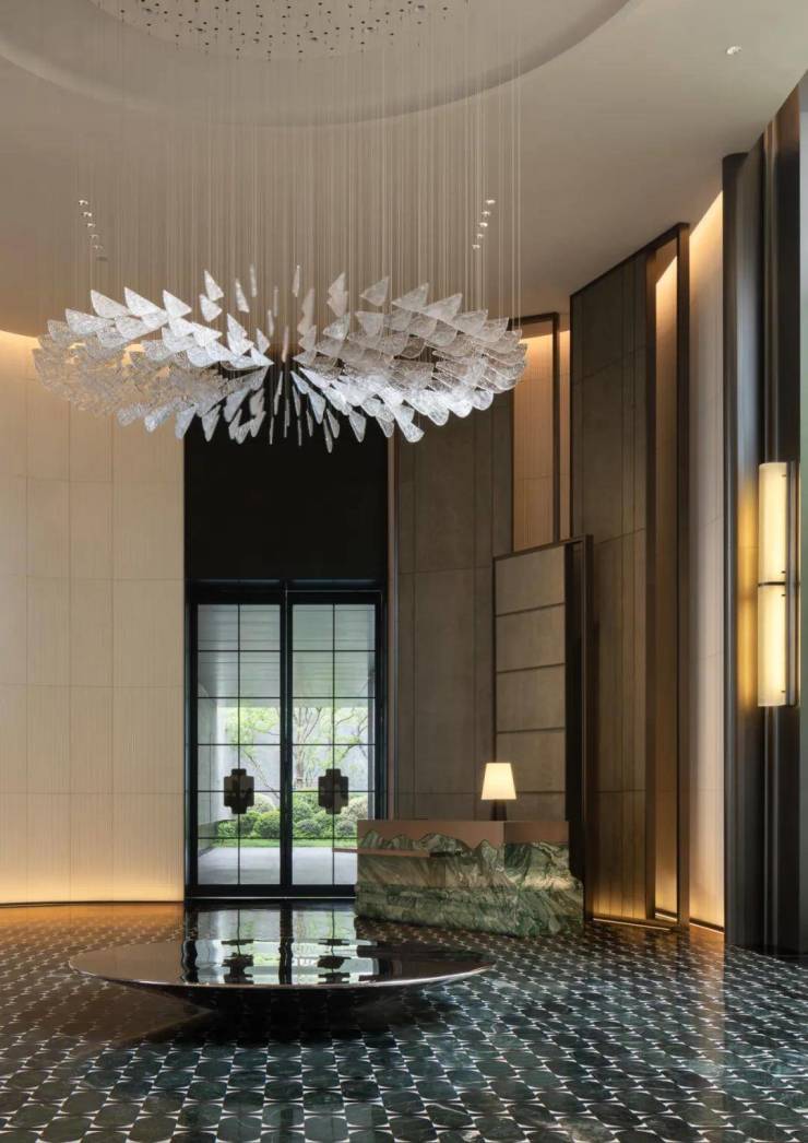 以透光的伊朗进口玉石形成玉树的圆盘底座,如一块巨大的玉璧平安扣,以温暖的光芒庇佑宾客出入平安。