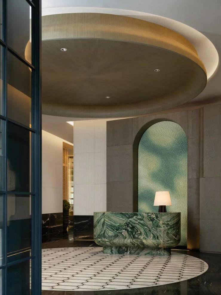 空间主色调为定制的“珺玉色”,在室内、住宅公区随处可见的星空猫眼绿奢石,被人工雕刻过以后,便具有了灵魂。海晏天珺把繁复的编织艺术,用“玉石”的语言,谦逊而隐蔽地铺在你回家的路上。