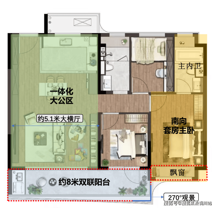 同时还解决了小户型采光不足的痛点,三开间南向采光,装下约6.4M的南向巨幕阳台,270°环幕观景!一家人在沙发看电视、在餐厅吃饭,都能有舒适的清风、阳光相伴。