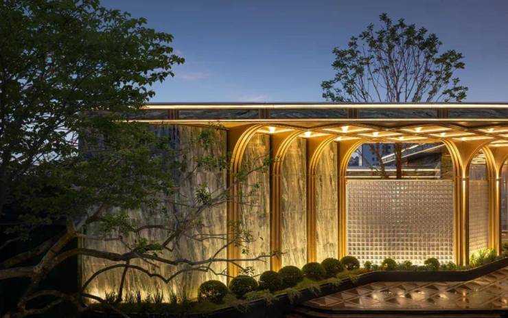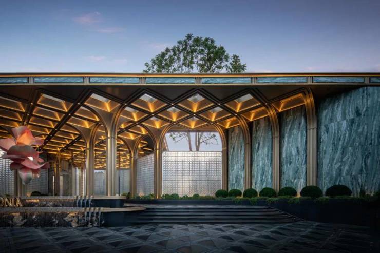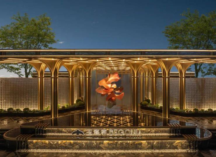 同样抢眼的,还有约20根约7米高的香槟金色立柱——海棠玉树,融入了传统的斗拱、榫卯技艺,搭配太阳纹的琉璃砖,整体看上去非常挺拔、通透。