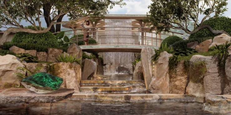 又比如,中央水景的池底和池壁,运用了宇宙黑金,让水面显得格外澄澈,层层叠瀑倾泻而下,与上方的海棠花雕塑相映成趣,为归家之路增添了灵动感。