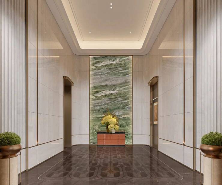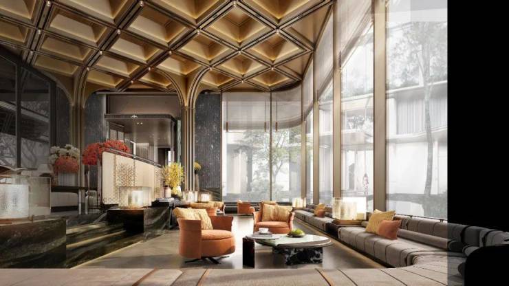 推开大门,便是以上海宝格丽酒店为范本的序厅,中空采光、酒店式大堂、下沉式会客厅等设计,也延续了项目的奢雅质感。
