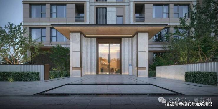 建筑立面选用米白与暖灰的现代轻奢色系,局部铝板线条+涂料一体板+石材及涂料组合使用,简约线条设计,彰显现代典雅美学风格。