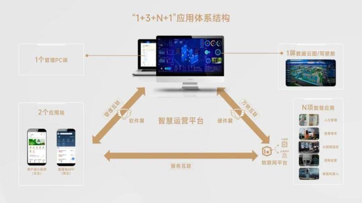 具体说来,由开发商斥重金统一建立社区智能化平台,并以此为枢纽,搭建1+3+N+1智能化应用体系结构。相当于为社区植入一个“超级大脑”,不仅能够提供服务,更能根据业主对服务的反馈,全面优化服务。