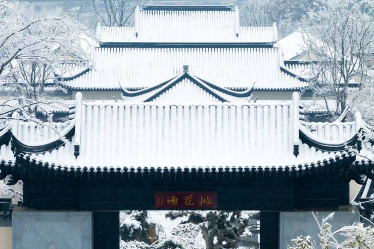 初读雪中的武汉桃花源,有一种刚柔并济的美。大气洒脱中,蕴含着精致多情。恢宏的中轴对称是北方古建的壮阔,优雅的檐牙高啄又是南方古建的情调,南北顶尖技艺的融合,让武汉桃花源呈现出更优雅的形态:在大家门庭之中,增添了飒爽英姿。