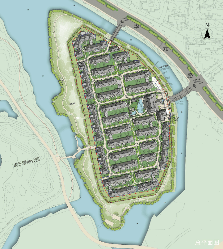 小区出入口设在华元路,靠两座桥连接社区,西边还有专属人行步道直通虎丘湿地公园,真正实现“一步进公园”。