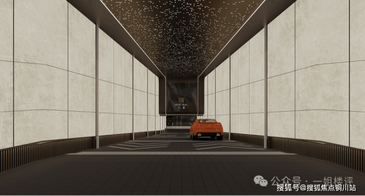 作为豪宅的第二门面,地下车库也极具豪宅气度。地库坡道墙面选用仿云石亚克力透光板,还规划了星空顶及奢石迎宾墙……