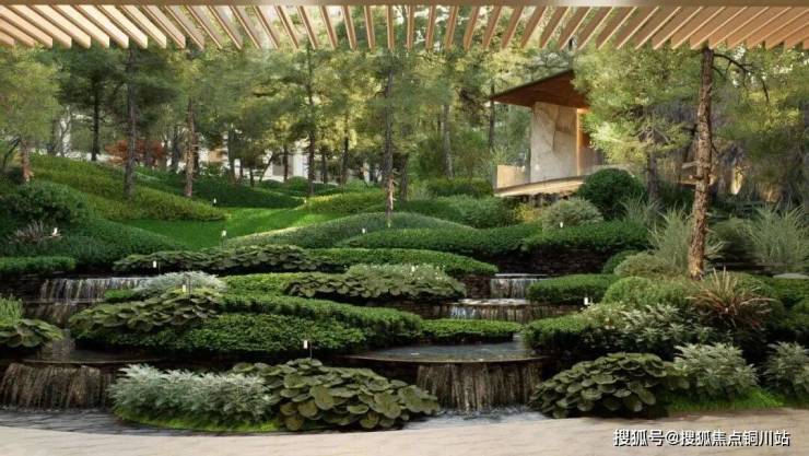 小区主入口隐于林木之中,前岛公园与中央园林无缝衔接,漫步归家,俨然从公园走进另一座公园。天光绿意投射进负一层下沉式“养心谷”,照亮业主的多功能共享空间。