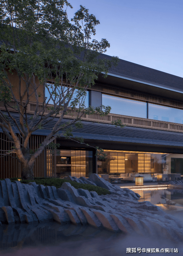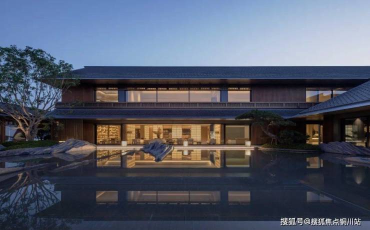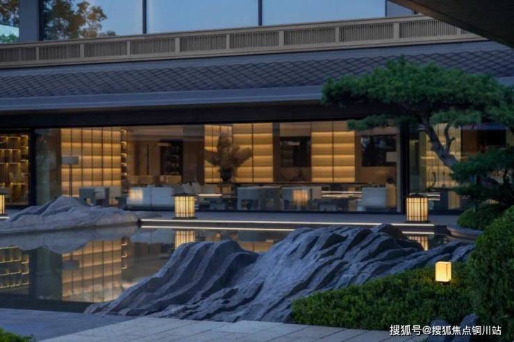 合院中的方庭,以平静 的水面倒影出明亮 楼宇,将场地的 视觉效果放大,使有限的 面积问题得到解决 。池畔的地灯,散发温暖的点点光芒,照亮前路,也为夜晚的方庭增添静谧的氛围。