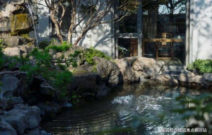 行至园中一角,不同形态的置石将池水边界掩藏,一眼望去,水面无尽。跌水自高处而下,滴答之声不绝于耳。绿植探向水面,与层层涟漪相望,倒映出一幅动态画卷。