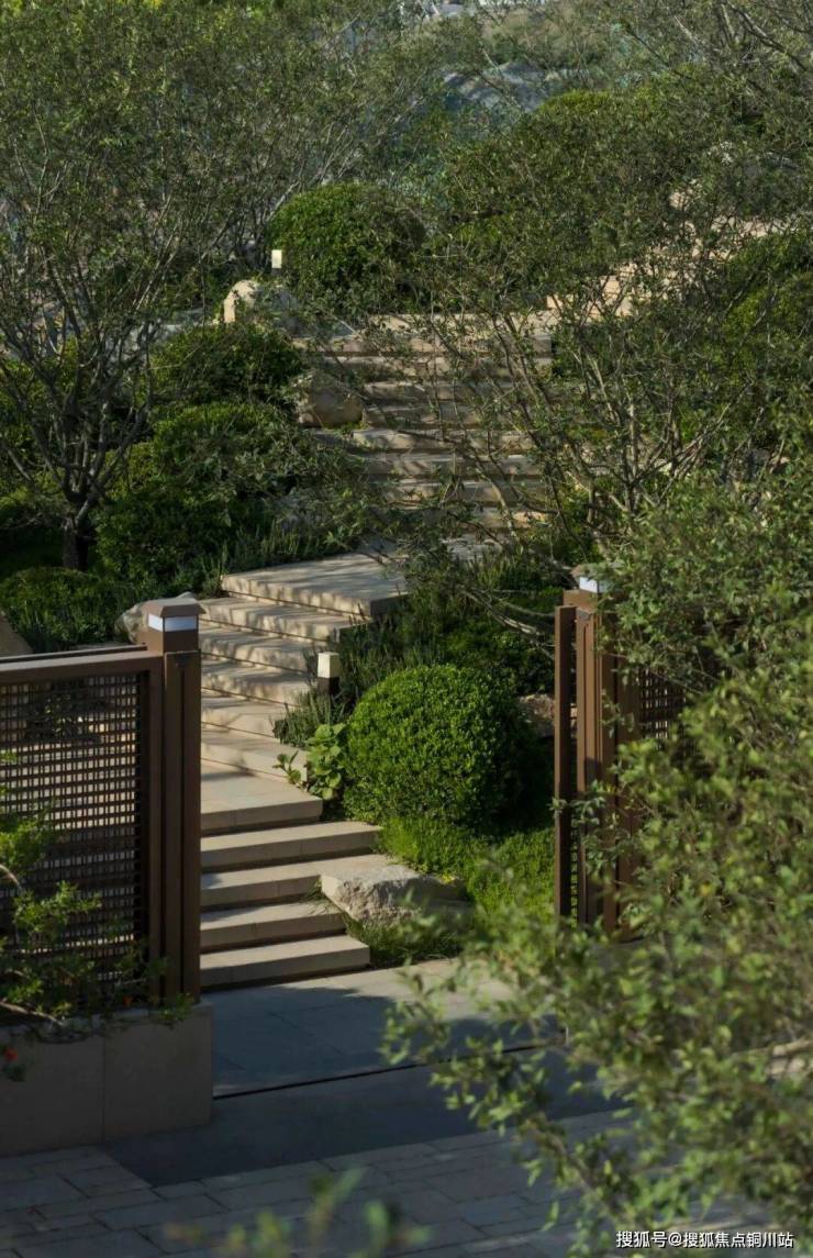庭院之外,是一段具有高差的花下山林步道。步道两侧种植着山桃、 枫、竹、银杏、紫薇、海棠等国风气质的植物诠释人生境界。夏时漫步 其间,如踏入幽静山林,生态自然养居氛围油然而生。花期时,看漫山花雨开遍,闭目静默闻花香。