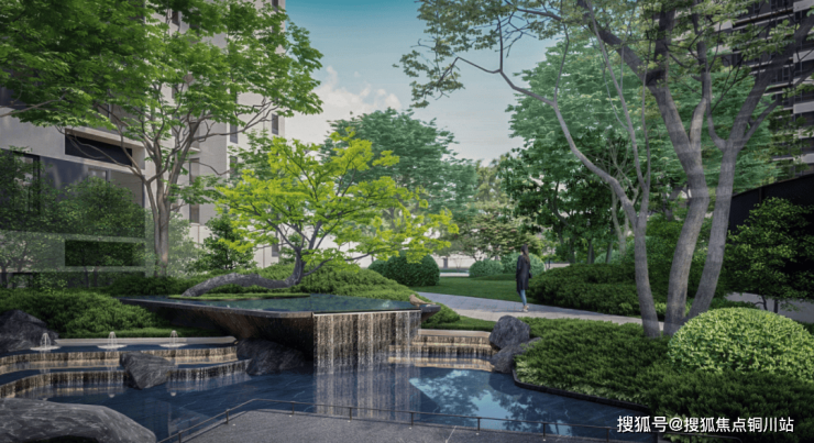 比如,A/B地块主入口轴线景观,增设氛围感更强的跌水水景及置石,扩大铺装广场的空间,让种植的绿色层次感更强,更有归家仪式和尊崇感;