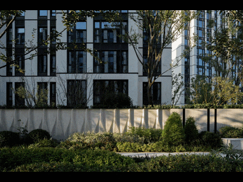 从细节上看,每一处石材景墙设计都透露着江山万里别致的设计巧思:春芽、夏木、秋果、冬枝,使用“黄金切割线”构造石材进退、拉槽的造型,呈现四季变换的时光肌理,彰显独特的东方审美。