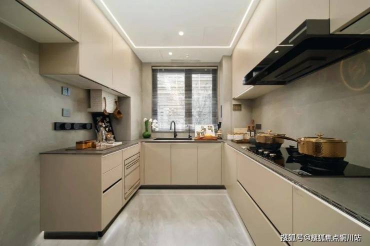 厨房配置博世三件套、三眼灶台、大单槽水池,预留有双开门冰箱位置。操作台面空间充足,同样提前展示了强大的厨房收纳功能。