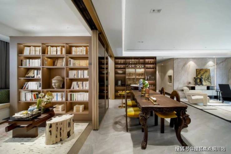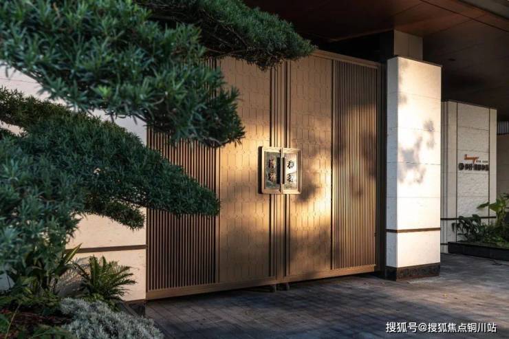 这是近期公开的南大门,开发商专门从古老山林中全冠移植了2棵造型罗汉松,搭配古铜色大门,庄严古朴,又气派阔绰。并且,项目建面约113㎡的样板间也是实体样板间,真实的空间尺度都能看得到。