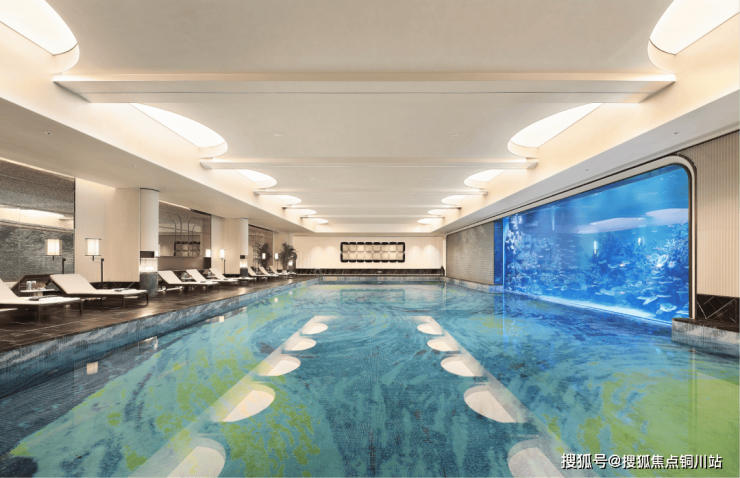 巨幅水族观景窗,将深海的静谧与恒温泳池的活力相连。浸入池中,与悠游的鱼群仅一窗之隔,池底闪烁的《星月夜》艺术马赛克与水面光影交织,成就“醉后不知天在水”的诗意。