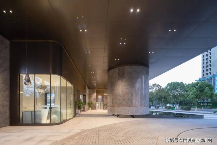 社区入口采用意大利灰大理石作为墙面主材料,密缝拼接,铺陈出沉静而雅致的氛围气息,屏蔽掉城市的喧嚣。主要墙面及材料交界处分别设计了古铜色金属线条和凹槽。倒圆角的设计,让整个门头显得更加温润而亲切。