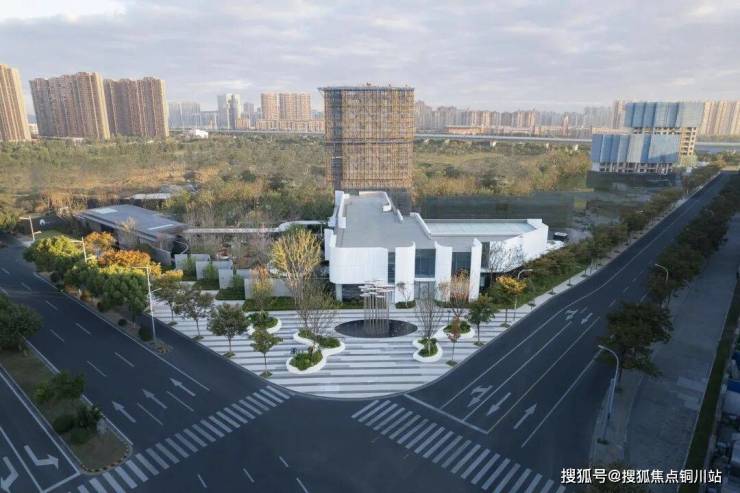 生活馆与社区入口之间围合一块三角形用地,两个主体之间利用风雨连廊衔接,保证人流到达的舒适度和便捷性。连廊围绕三角形用地蜿蜒展开,一侧水波粼粼,一侧碧草绿荫。在有限的动线长度,尽可能让客户感受到自然所带来的愉悦感。