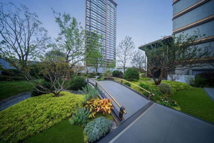 在建发璞云,登临虹桥,步步高升,乌桕、香樟、女贞等高大乔木挺拔,还有红梅、晚樱、紫薇、红枫等错落分布,疏影横斜,更添韵味。