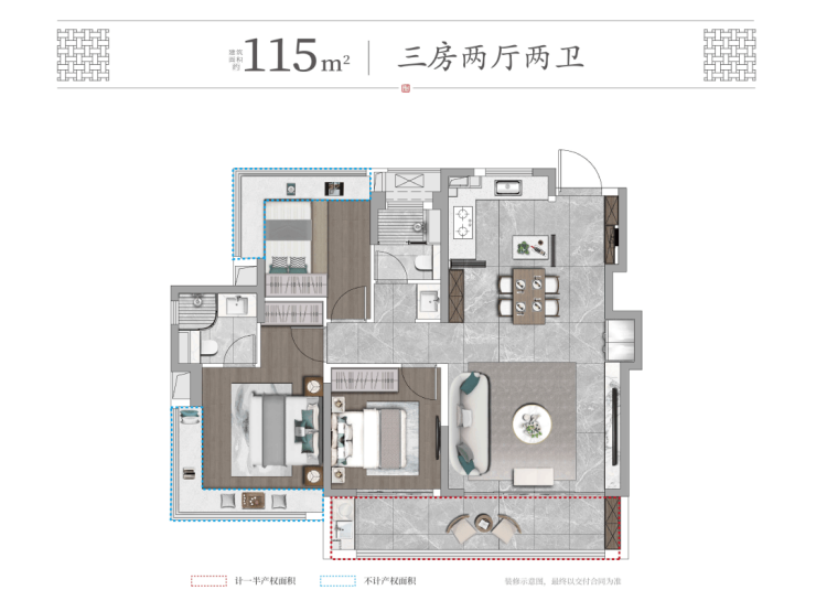 建面约115㎡:边户,三室两厅两卫,一体化S墙冰箱收纳,空间利用率max;约7㎡中西双厨可开合魔法厨房,体面就餐更舒适;主卧与北次卧270°观景飘窗,景观一绝,堪称同面积段王炸!