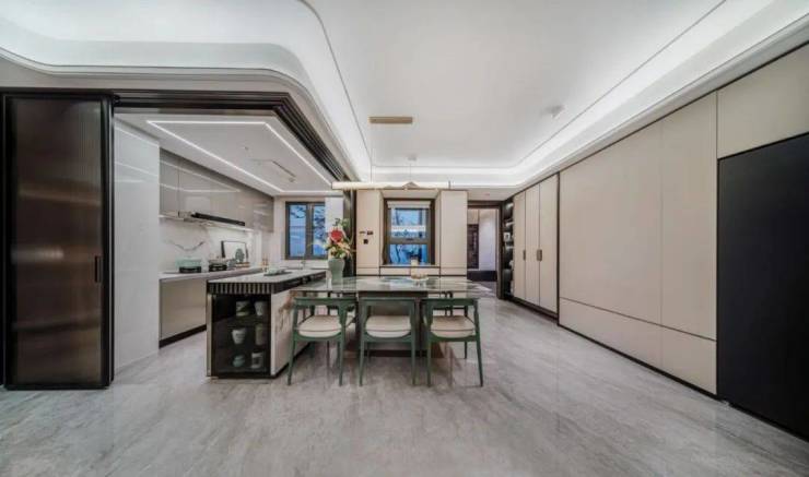 入户发光门牌+双开子母门+黑色金属门把手,高门大户的仪式感拿捏住了;通顶的浅色荔枝纹皮玄关柜,品味十足,收纳空间很是开阔;可开合玻璃移门+U字型魔法厨房,容纳三四个人同时做饭也毫无问题;还有可容纳6人同时就餐的超大餐桌,即便朋友来了也十分阔绰。
