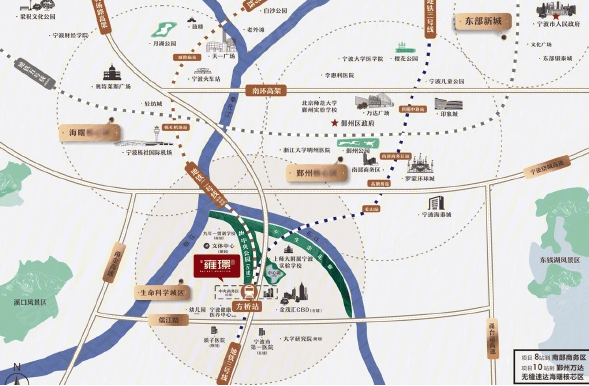 交通配套:紧邻地铁 3 号线方桥站,步行约 700 米即可到达,8 站可达南部商务区,10 站可达鄞州万达;通过机场路高架可快速到达宁波主城区,此外,还可直通栎社机场、宁波火车站以及联通朝阳高速入口进入宁波绕城、甬金高速、甬台温高速。