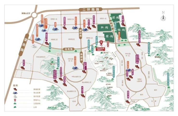 交通——二环南高架与顺河高架、二环东高架、二环西高架连接,搭配多条城市主干道,形成四维立体城市交通路网,约20分钟即可直达泉城中心,约40分钟即可通达泉城各处。领秀城内8条公交线路,30个公交站点,所有公交站点均在步行约400m范围内,无需换乘,可快速通达济南重要交通节点。