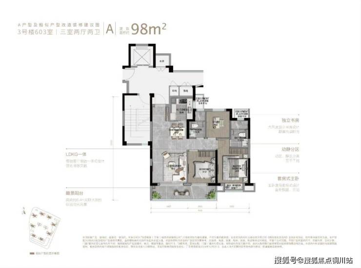 三房格局,LDKG一体化设计,南向约6.4米双联阳台,主卧套房式设计,适配多种需求家庭。