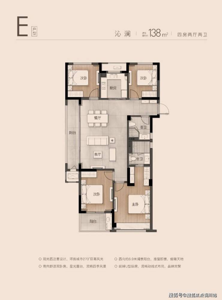 建面约138㎡四居室:阳光西边套设计,西向超宽阔景阳台,是观赏日落、栽培绿植的绝佳场所;双南向卧室设计,保障了家庭成员都能拥有温暖明亮的休憩环境;阔绰的U型厨房,操作台面充足,让烹饪成为一种享受;全屋采用科学流畅的动线布局,有效提升家庭生活的品质,尽显大宅风范。
