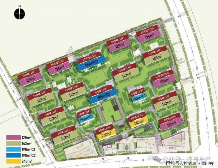 项目所有楼栋均为纯板楼,两梯两户布局,每一户均有独立电梯前室,且每栋楼均只有一个户型,项目有125㎡、143㎡、190㎡C1、190㎡C2、240㎡五种户型。产品利用露台、花池、飘窗等优化空间,得房率约在95%--111%。(提示:项目样板间非实体楼栋,此处户型尺寸均为官方宣传图纸所示)