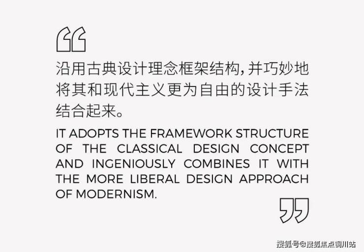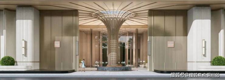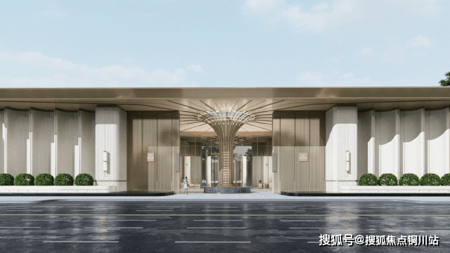 近人尺度的入口空间,摒弃了堆砌繁复华丽细节的雕梁画栋,删繁就简,采用更加简洁大方的设计手法,以体量作为构图,返“璞”归真,呈现温润质朴且优雅的效果。采用带有凹槽肌理的仿石材铝型材,给人的质朴纯粹的东方神韵。