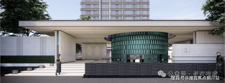 社区的主入口还将打造一座城市级的雕塑,绿陶板的流光肌理与金属收边,碰撞出中北路上的“只此青绿”。进入大门,则是6米高的定制绿陶板组成的环形门庭,让归家变得充满仪式感。
