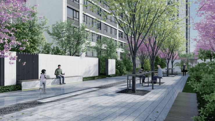下楼即是项目的主要景观组团——樱花大道。花季之时,繁花似锦,蝶粉蜂黄,羊脂白雪半面妆。不用去日本也不用去武大,在自家门前就能成功打卡。