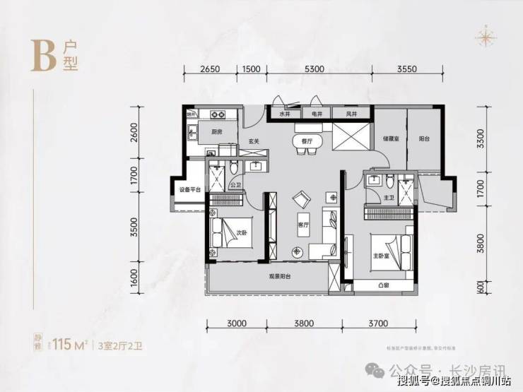 B户型-约115㎡ 静雅三房 全开间朝南 餐客一体化 约6.8m南向阳台