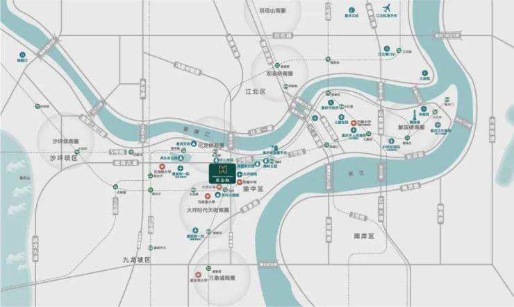 踞守重庆城市中心与五大商圈(解放碑、时代天街、杨家坪、沙坪坝、观音桥)物理圆心,半径3公里覆盖80%城市资源。