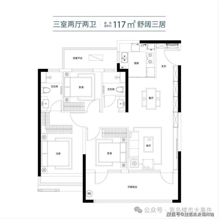 建面约117㎡升级为三室两厅两卫,实现88%得房率,同比市面约125㎡户型得房面积,满足三口之家的居住需求,并预留二胎空间,契合改善型客户的核心诉求。