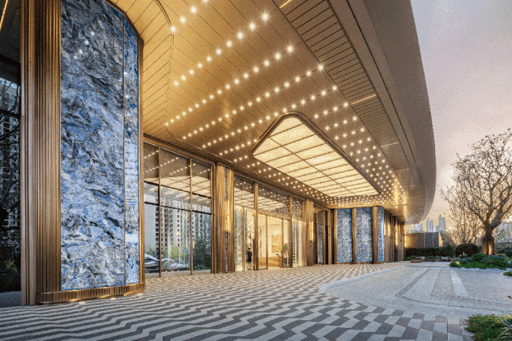 以美学笔触,勾勒建筑线条,提取曲线元素柔性美应用于立面美学设计,独特的建筑弧线,打造立面流体韵律,营造别具一格的天际美学。以酒店式设计,打造旗舰门庭,营造极致的尊崇礼序,星空穹顶地库中,流线光带如银河倾泻,让归家就像穿越艺术长廊。