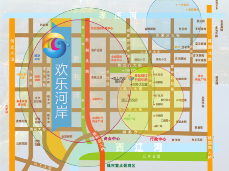 欢乐河岸项目由国际景观规划单位泛亚国际进行景观设计,由中国中建设计集团有限公司进行建筑设计,设计院院长薛峰亲自挂帅组成专家团队精心设计,将该项目打造成为国际建筑群,成为内蒙古乃至全国一条独特的滨水景观建筑风景线,即是通辽都市娱乐目的地。 欢乐河岸项目由通辽万华房地产开发有限公司开发建设,位于通辽市新城区胜利北路西侧,南起西辽河,北接孝庄河,总长2180米,宽127米,涵盖人工河、绿化带、商业街等三部分,总占地面积27万㎡,工程总投资约4.2亿元,是通辽市一条亲水景观商业街。 欢乐河岸项目人工开渠连接西辽河和孝庄河,打造出一条人工河即胜利河,沿河东侧建设开放型公共休憩景观区,西侧建设商业街,整体以景观桥串联,柳荫路、洪河大街、阿古拉大街、凤凰山大街,青龙山大街,叫来河大街等六条城市干道横穿而过,将该项目分隔为六大区域,各区域既独立成群,又整体通联,交通便利,快捷通达。