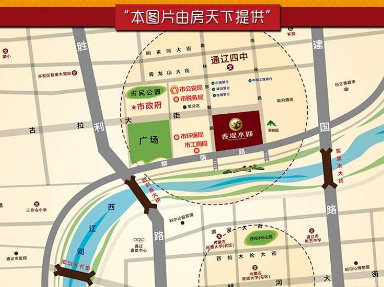 中小学:第四中学、通辽职业学院、科尔沁职业艺术学院、希望小学; 幼稚园:二期项目双语园; 医 院:河西市医院; 银 行:中国银行、建设银行、工商银行、农村信用社; 综合商场:三期大型商超、7万平商业网点; 会所、休闲公园