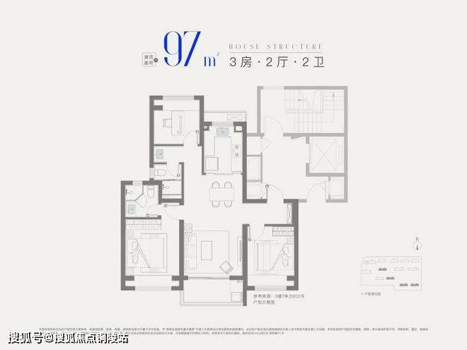 建面约97㎡3房2卫,升级版大3房,入户玄关+主卧套房设计,整体私密性更强,空间更为宽敞。