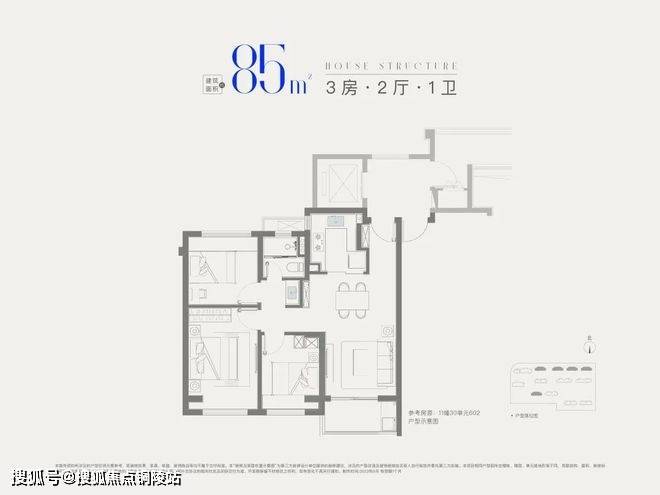 建面约85㎡3房1卫,做到三开间朝南+全卧室带飘窗+卫生间干湿分离+动静分离,非常紧凑的小3房。