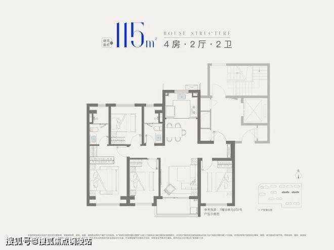 建面约115㎡4房2厅2卫,做到了四开间朝南+全卧室带飘窗+主卧套房设计,一步到位的大四房户型。兼顾大4房的功能性和空间尺度,非常难得,更适合四口之家或三代同堂家庭居住。