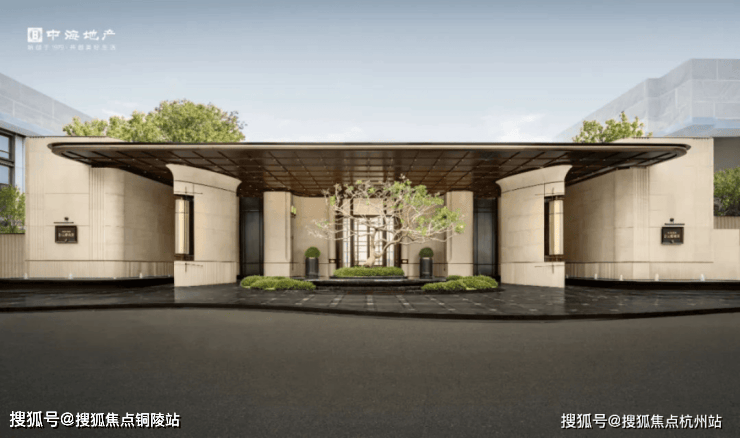 项目的主入口,门头承袭玖字理念,约55m横向尺度与约7m纵向高度,高于传统的约4m高景墙,搭配通高陈列的全石材柱体,恭迎业主归家。