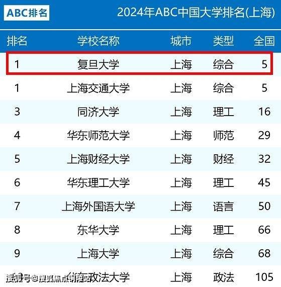 根据认可度、权威性更高的2024年ABC中国大学排行榜,2024年复旦位列上海第1,全国第5。