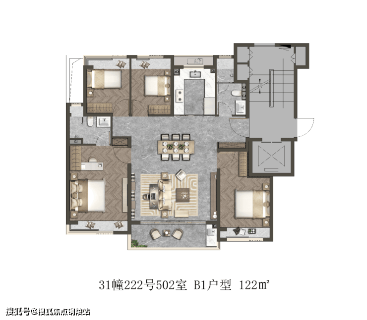 这套户型依旧拥有超高的实得率,6飘窗+1阳台的设计,且无纯走道空间,使得整个户型的可使用面积大大增加。