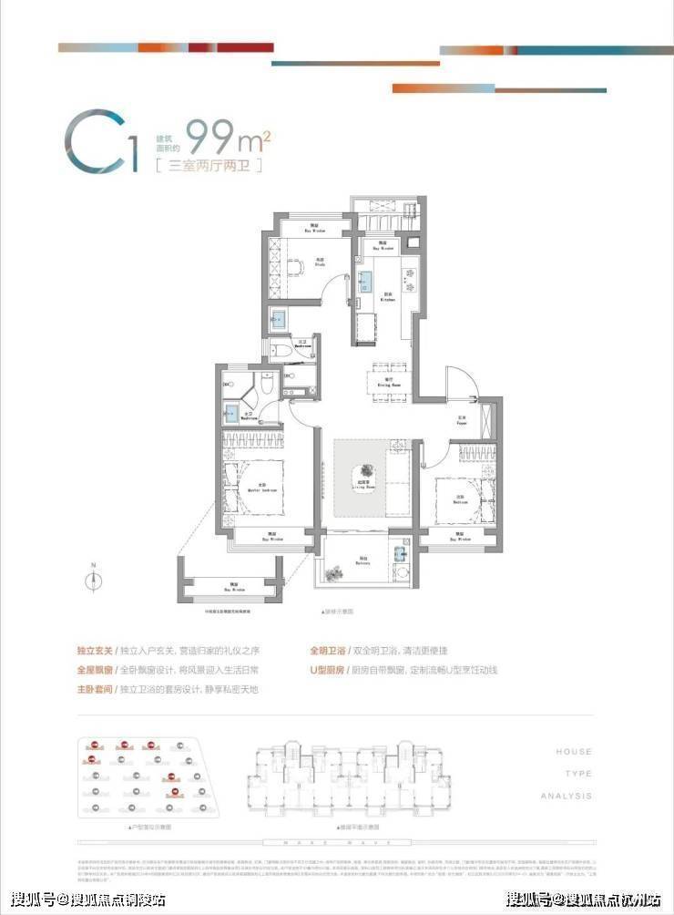 建面约89㎡三房,三开间朝南+双飘窗设计,U型厨房与干湿分离卫浴兼顾功能与美学;