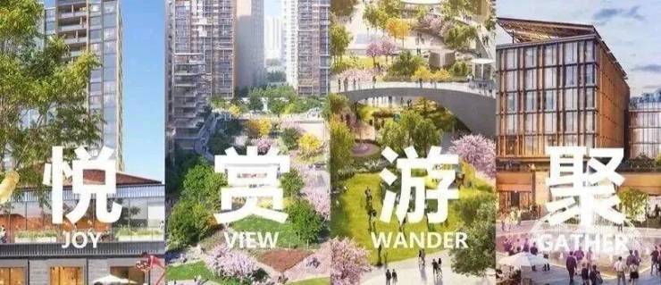 “真如翠谷”规划以“悦”、“赏”、“游”、“聚”四大主题为脉络,相应打造了仓廪市集,中央丘谷,河畔公园和桥水门户四大场所,并通过贯串全域的社区漫步景观带,将这些高品质公共空间有机串联起来,打造成为城绿共生、全龄友好、活力精致的大型高品质社区。
