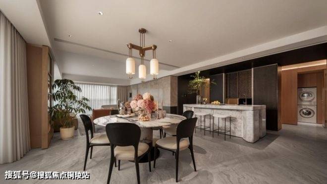 厅内空间充裕,既容得下大家庭聚餐的超大圆桌,也有独立西厨岛台,满足高净值家庭多元烹饪需求。