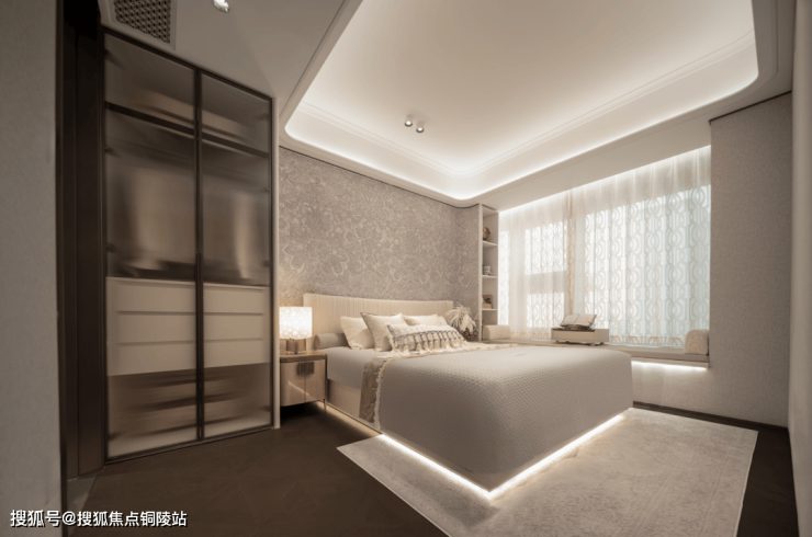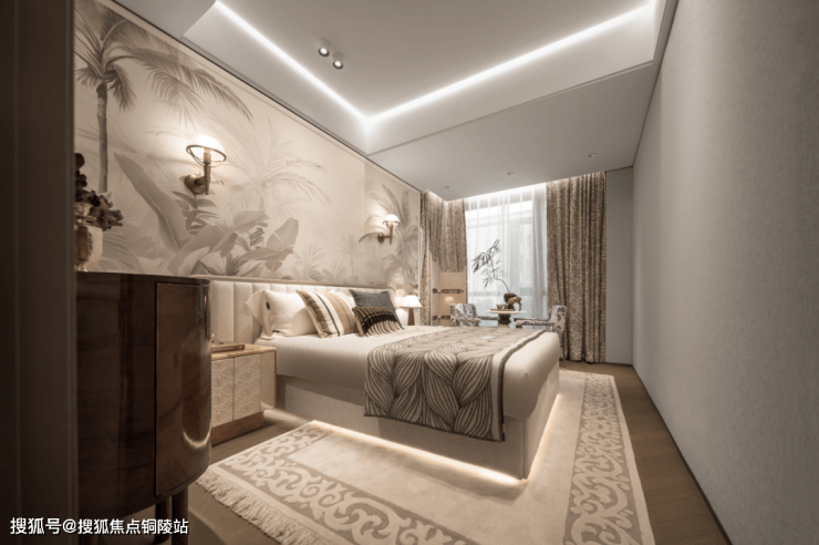 即便放了双人床、两个床头柜、一个收纳柜、两个休闲座椅和茶几,空间依旧绰绰有余,尺度感惊人!